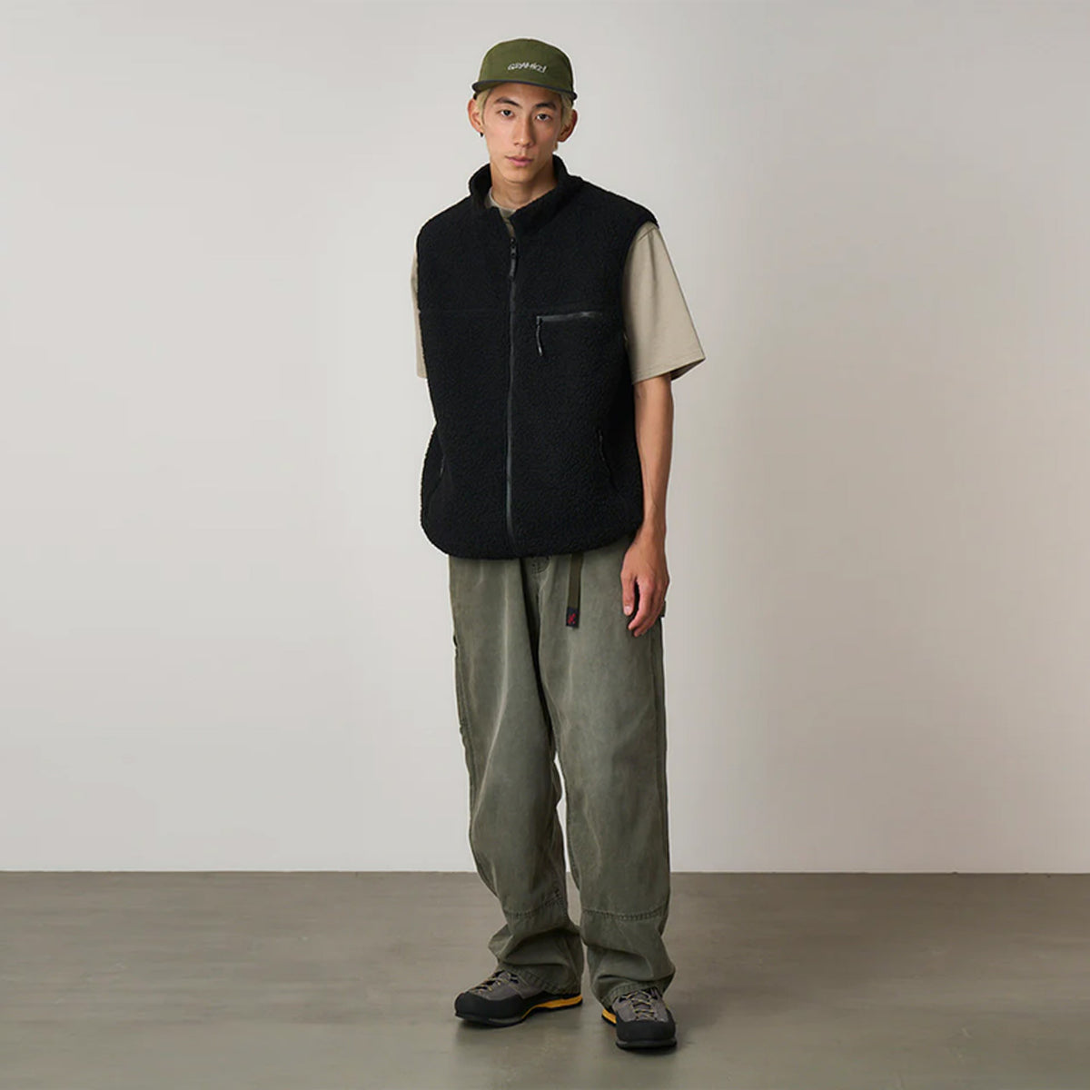 Gramicci リバーシブル シェルパ ベストは、“フリースの心地よさ”と“リップストップの実用性”のどちらを選ぶか迷う人にこそ向く一着です。デザインは、本当に優れた発想と見なされていた1980年代のアウトドアギアに着想を得ています。片面は厚手で毛足の長いシェルパフリースを使い、まるで羊に抱かれたような暖かさを。もう片面は高密度リップストップナイロンで実用性を確保します。どちらの面を着ても使えるよう両側にジッパーポケットを配置。ここまで実用的な2Way仕様はなかなかありません。