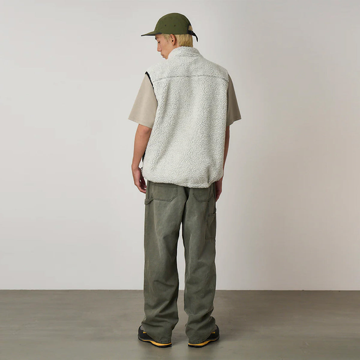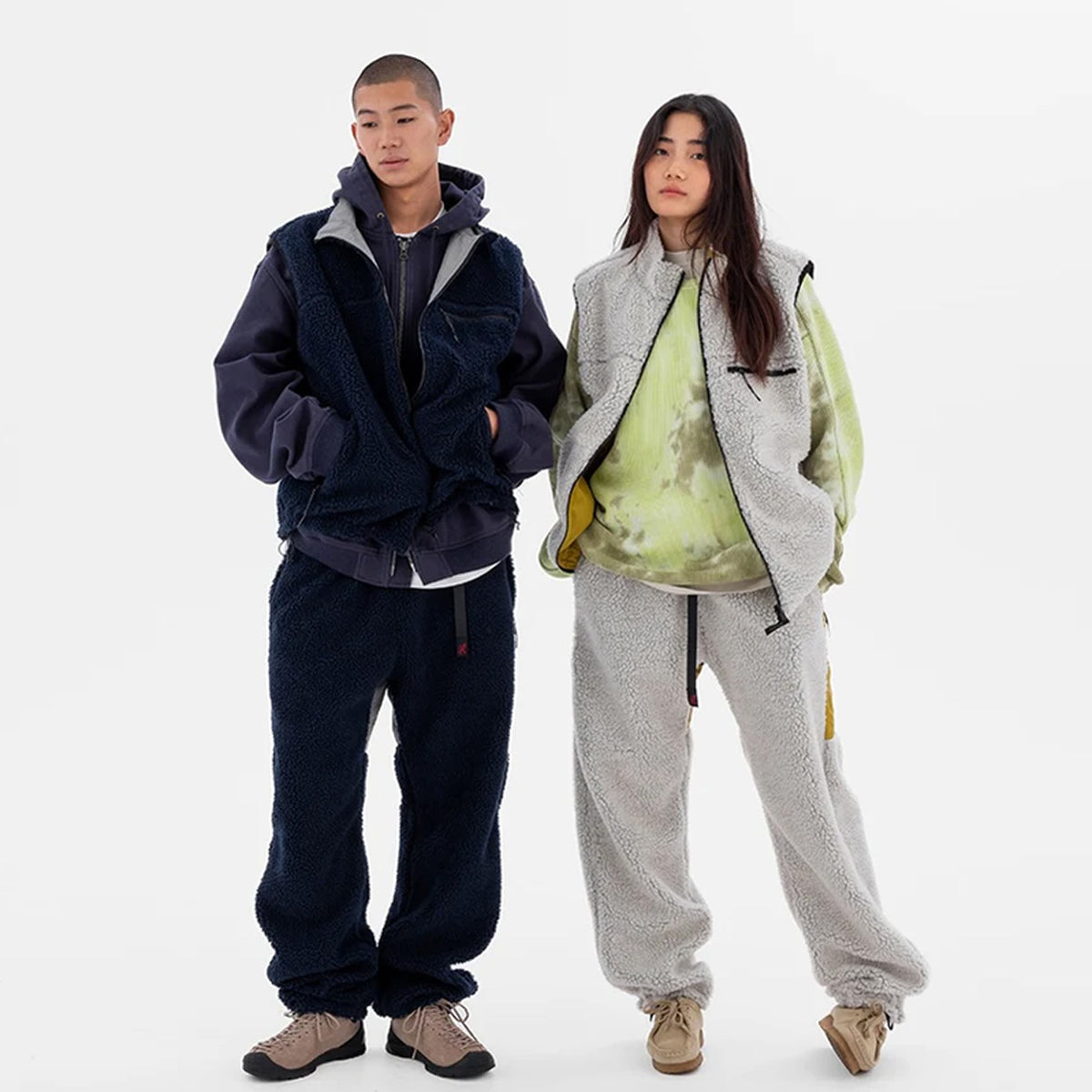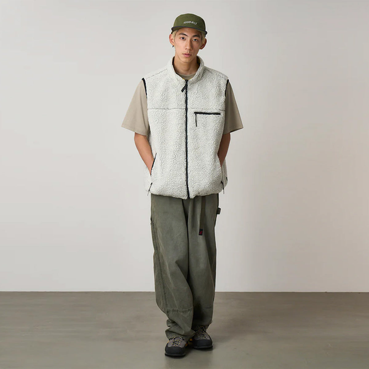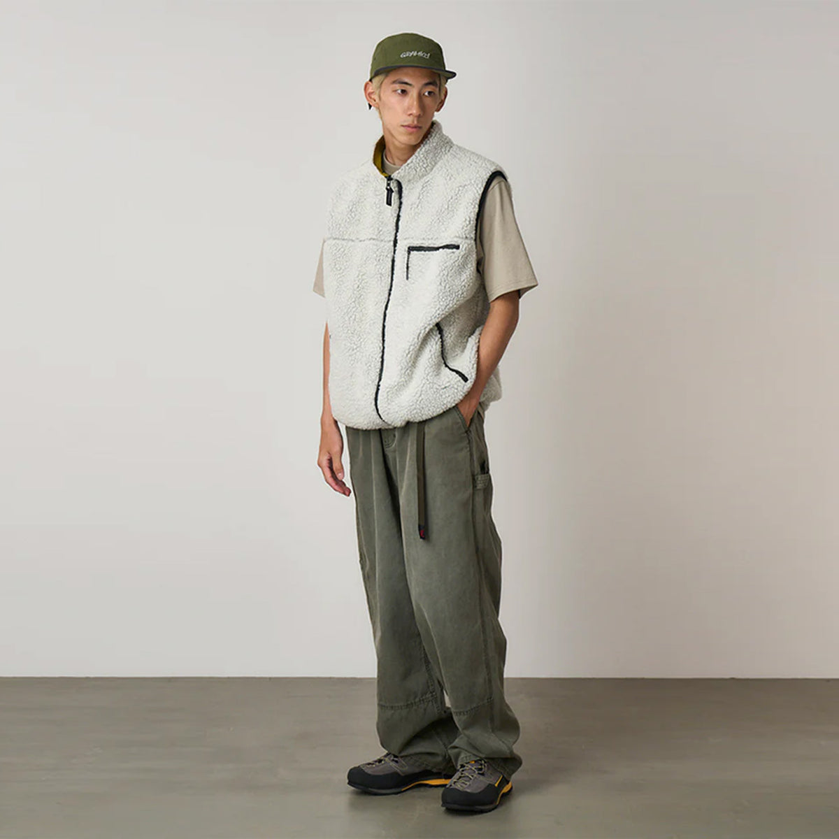 Gramicci リバーシブル シェルパ ベストは、“フリースの心地よさ”と“リップストップの実用性”のどちらを選ぶか迷う人にこそ向く一着です。デザインは、本当に優れた発想と見なされていた1980年代のアウトドアギアに着想を得ています。片面は厚手で毛足の長いシェルパフリースを使い、まるで羊に抱かれたような暖かさを。もう片面は高密度リップストップナイロンで実用性を確保します。どちらの面を着ても使えるよう両側にジッパーポケットを配置。ここまで実用的な2Way仕様はなかなかありません。