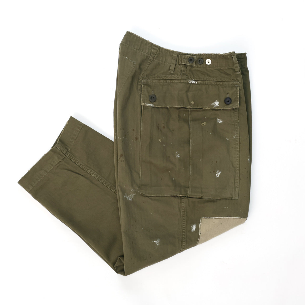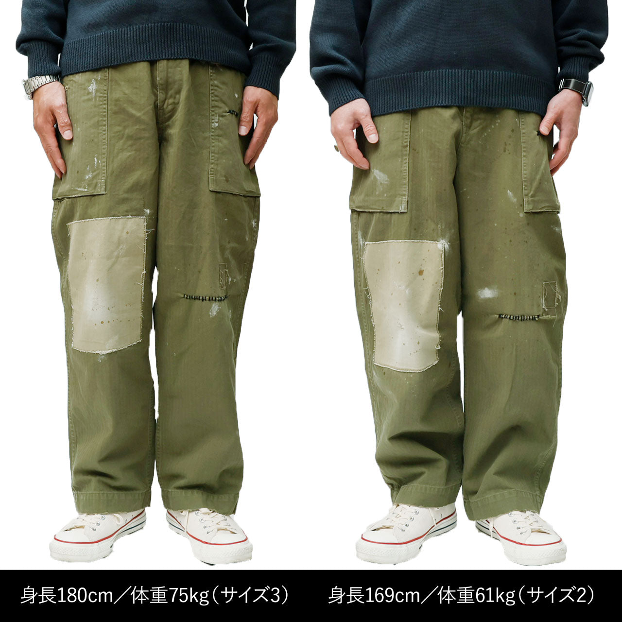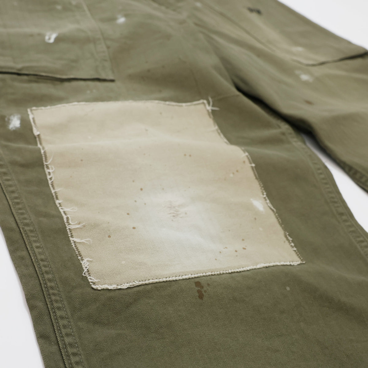 U.S. ARMY M‑43 HBTパンツを踏襲した2ポケット仕様のデザインに、ダメージ加工やペンキ汚しを施し、ハンドステッチや他色・他柄の当て布、後付けポケットなどをプラスして長年着古したようなヴィンテージ感を出したカスタマイズが施されています。