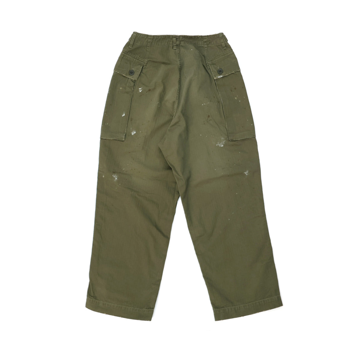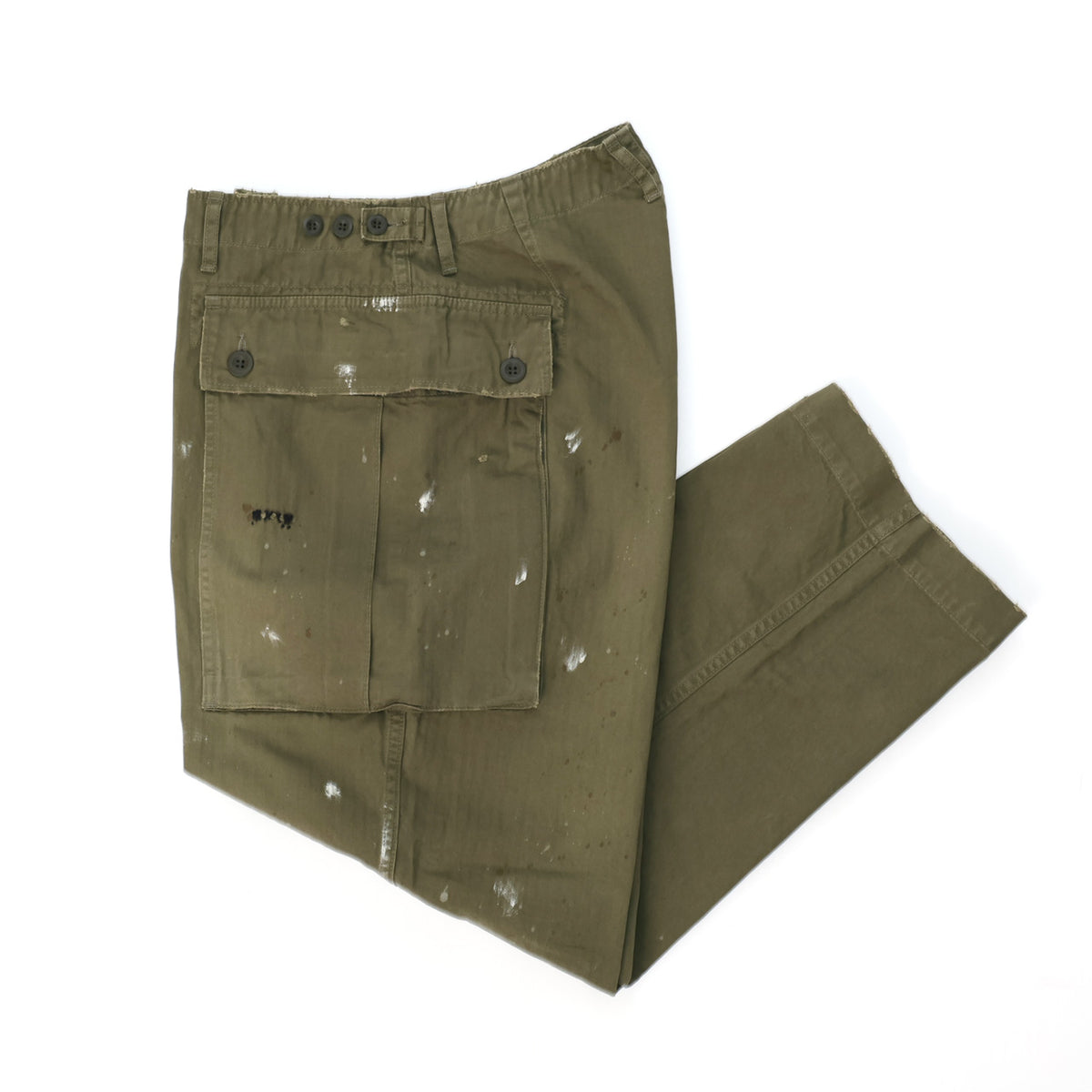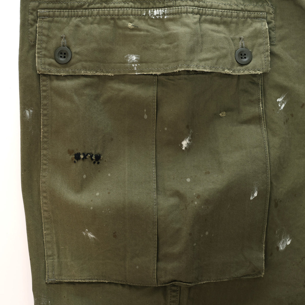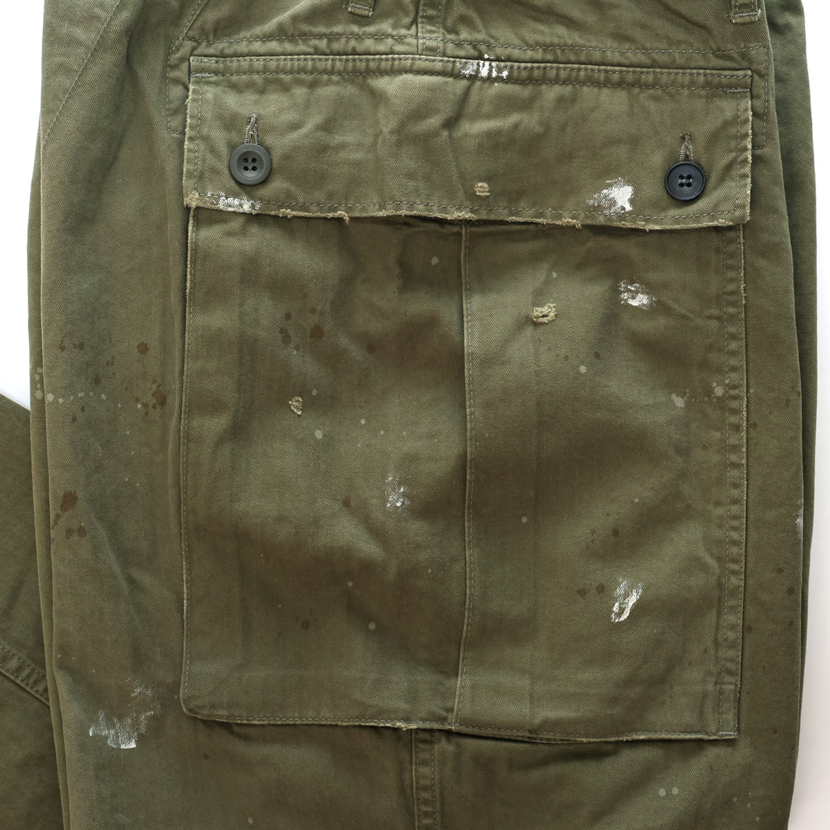 U.S. ARMY M‑43 HBTパンツを踏襲した2ポケット仕様のデザインに、ダメージ加工やペンキ汚しを施し、ハンドステッチや他色・他柄の当て布、後付けポケットなどをプラスして長年着古したようなヴィンテージ感を出したカスタマイズが施されています。