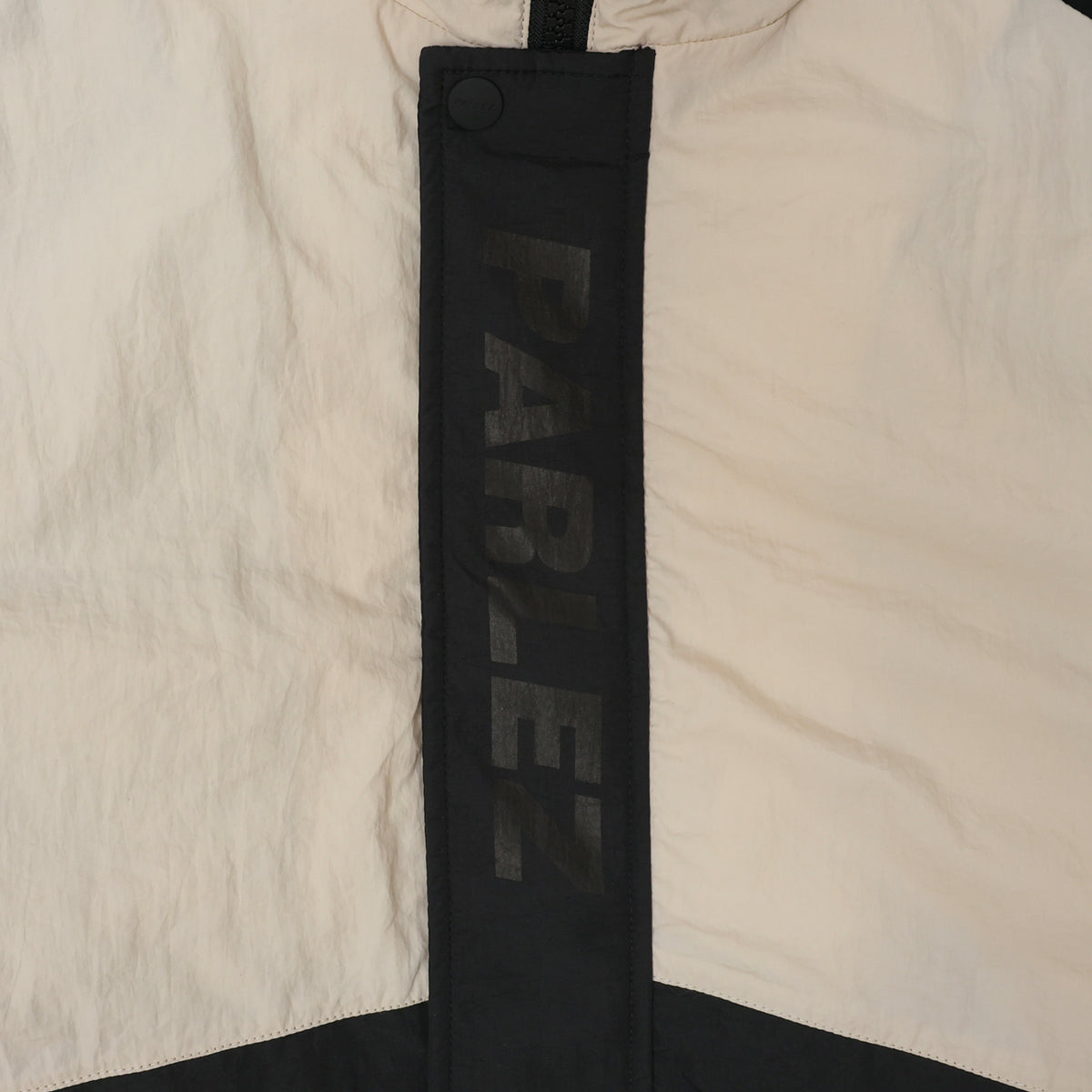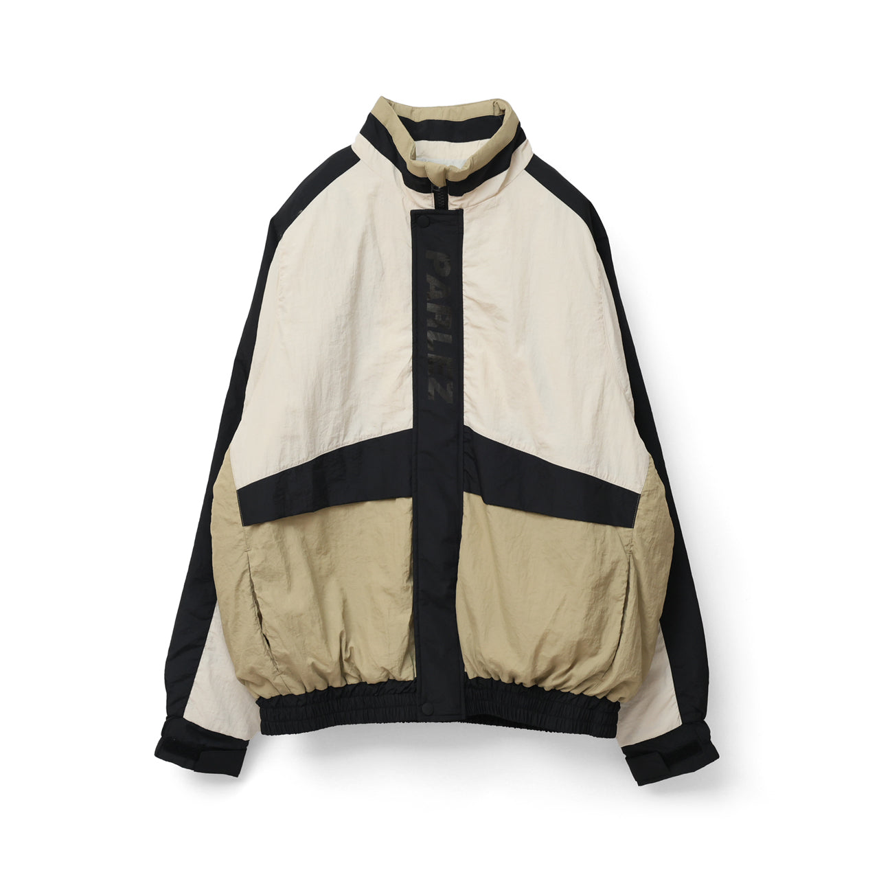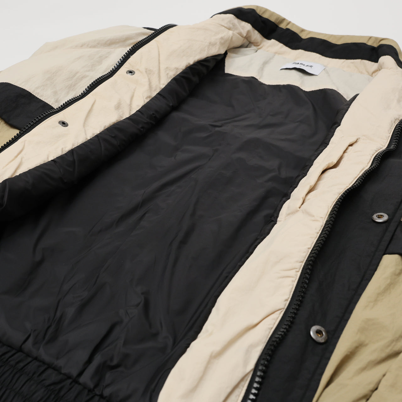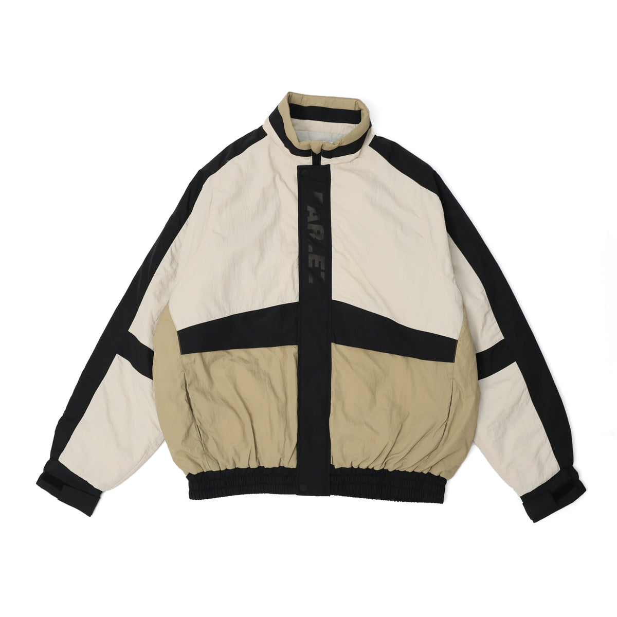 シェル素材のスラロームジャケット。100%リサイクルナイロンにエコフィルパディングを施した、軽やかな中綿入りのトラックジャケット。スナップボタン留めのプラケット付きツーウェイジップ、カラーブロックのパネル、ファネルネック、調節可能なバンジーコードヘムが特徴。背面とフロントのジッププラケットにはブランドロゴがプリントされています。